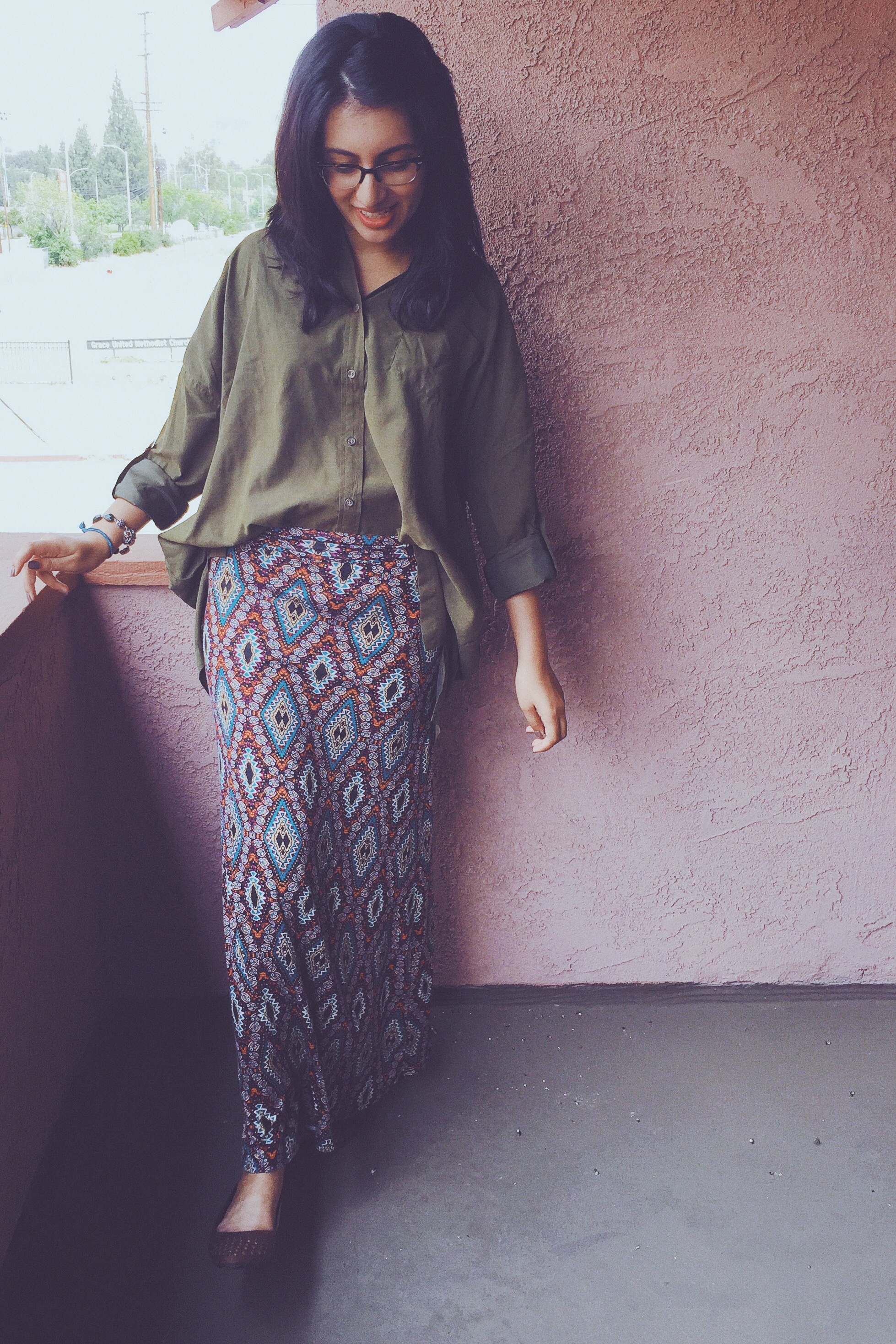 So as you can see I’m kind of a one trick pony, I again paired a bold pattern with a solid color. I paired this oversized olive green top with this colorful maxi skirt. I tucked the top in front to keep the boho vibe but also not look disheveled.