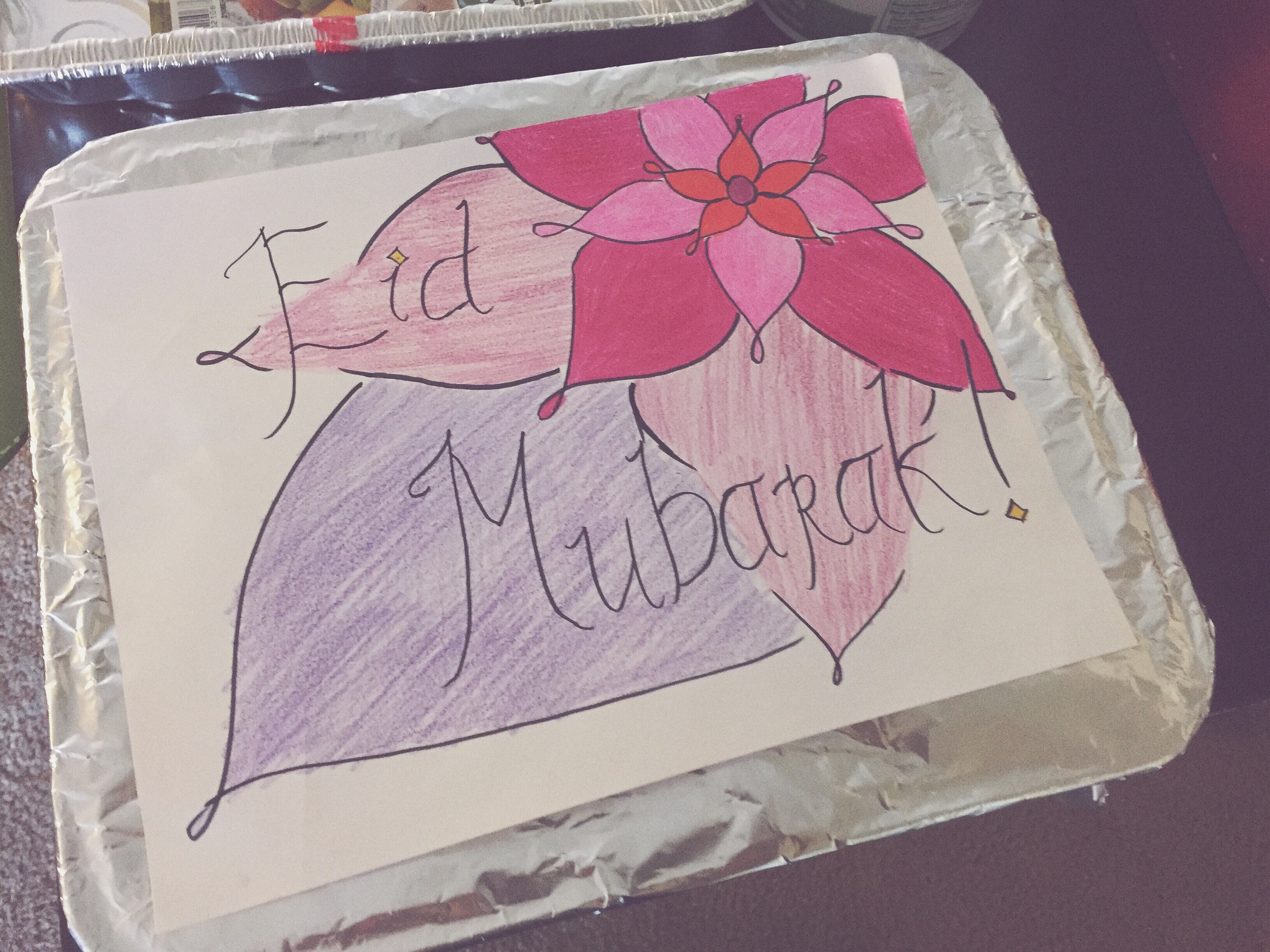 We’ve learned the hard way that the best way to give food to our relatives is in disposable foil trays. Our kitchen is relatively small so we only have as many dishes as we use on a regular basis and we usually end up leaving bowls, etc at other peoples’ houses and then are in trouble when trying to store leftovers. So I picked up a few foil trays this morning and I taped this sign over the foil on top. Can definitely work on the presentation in the future but it’s the thought that counts, right?