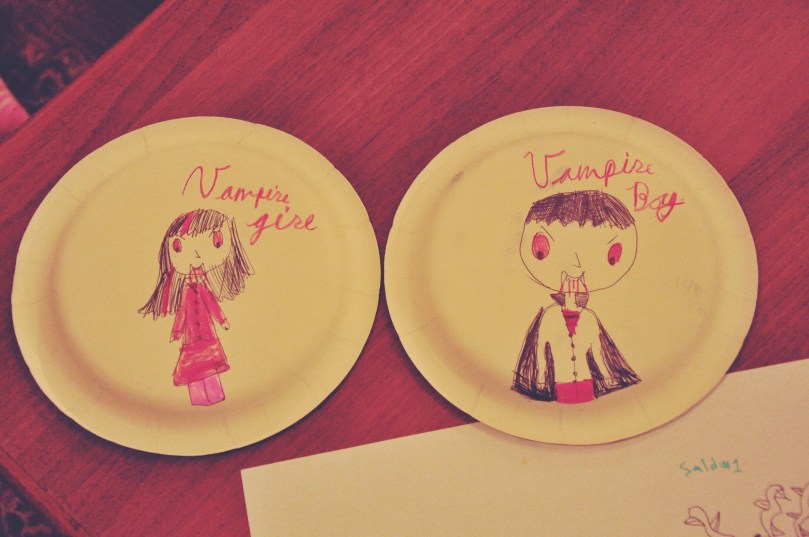 After he cut the cake we tried to get a family photo and we’re clearly reaaaally good at this heh. There’s a reason I stay on the other side of the camera! Just kidding, we did get a few shots where we’re all looking and smiling but I just loved how goofy this one looked. And I love how happy mama looks – makes my heart smile.   We started getting worried about the kids running around because there’s a pool in the back yard so I told them all we were going on an adventure and we came inside and colored on paper plates (and then eventually paper)! They drew characters, pictures of themselves, flowers, peacocks and shared stories about their drawings with each other for almost two hours!! In this age of iPads and phones, I was so happy to get them to play with each other and use their imaginations for a couple hours. It honestly felt like a little bit of a miracle.