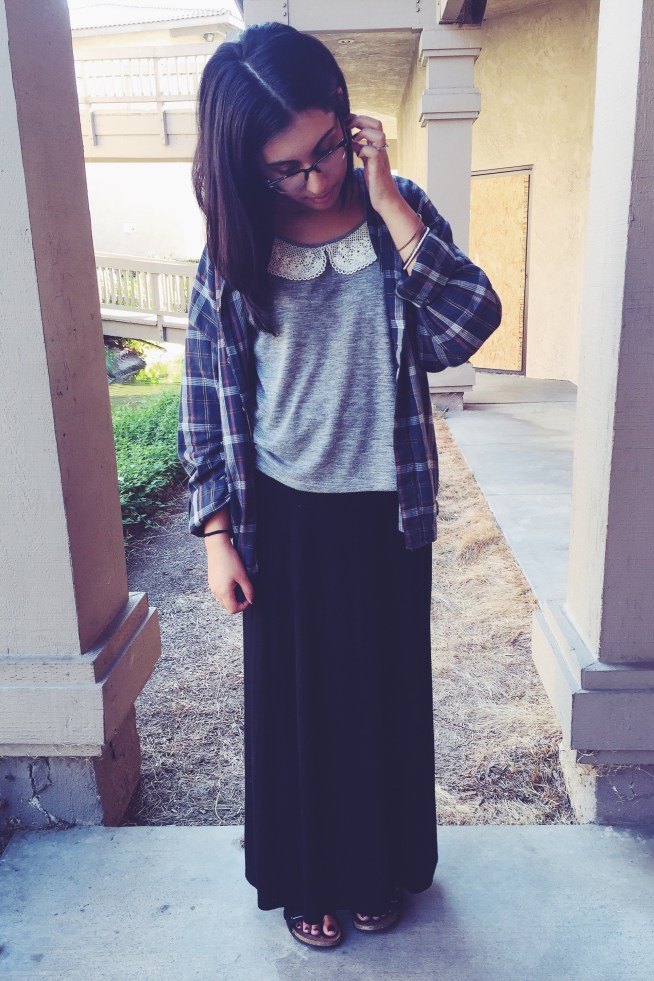 So back to this outfit, since it’s been relatively warm the past couple days I finally got a chance to wear one of my favorite pieces: this mustard midi skirt (also seen here). I paired it with a sleeveless collared floral blouse with a thin gray-blue sweater over.