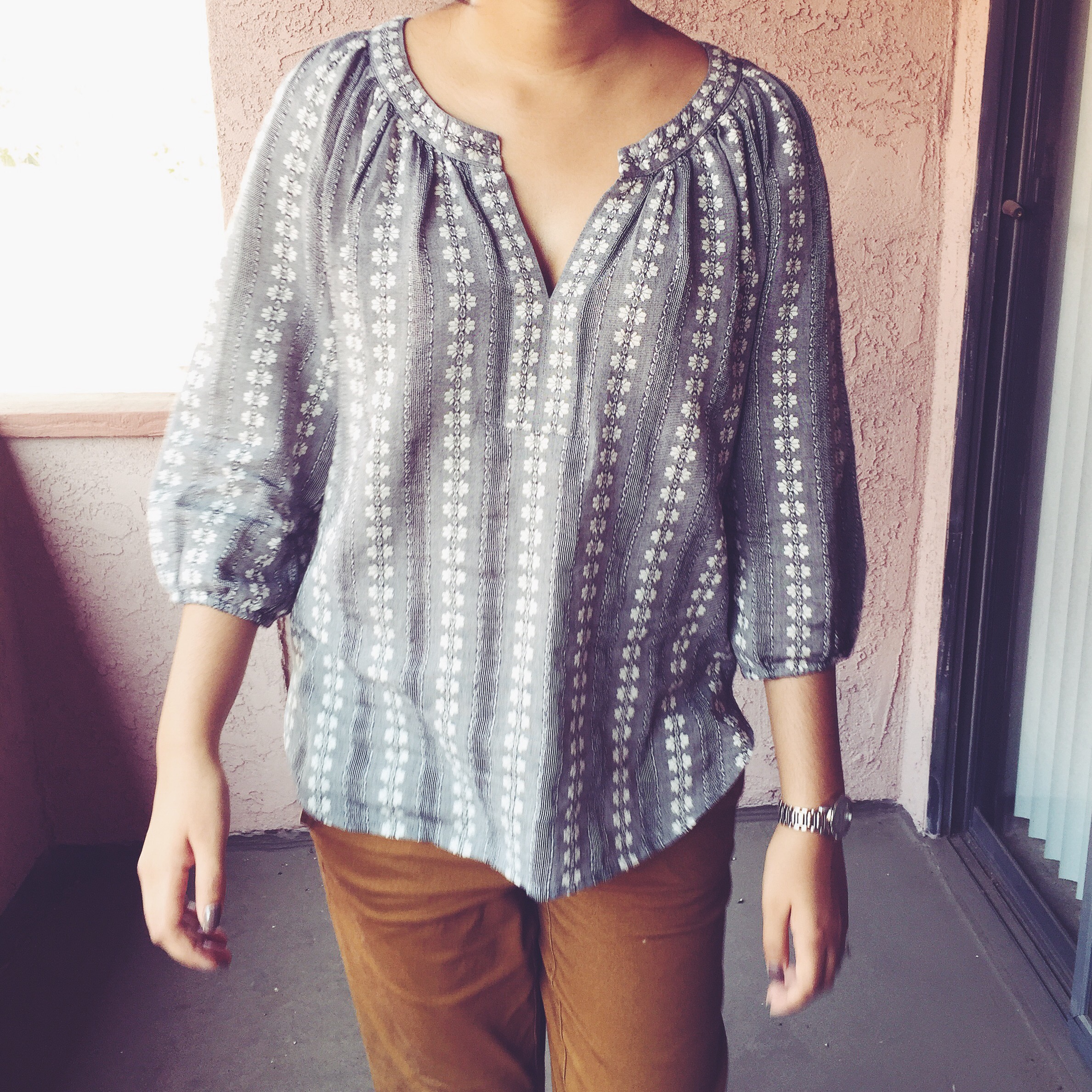 So back to this outfit, since it’s been relatively warm the past couple days I finally got a chance to wear one of my favorite pieces: this mustard midi skirt (also seen here). I paired it with a sleeveless collared floral blouse with a thin gray-blue sweater over.